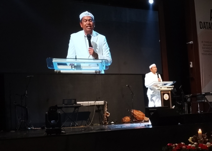 “Bahwa ajaran yang disampaikan Yesus ialah saling mengasihi. Intinya ialah mengajarkan kesetiaan, pembebasan dan mengajarkan kesetaraan dan seluruh ajaran agama satu yakni cinta. Malam hari ini saya melihat cinta tak terbatas, tak berukur, tak ternilai dan mungkin cinta yang siap menghadapi hujatan. Siapa itu ? ialah Wanita cantik yang berkerudung yang bernyanyi tadi disini. Nyanyi apa ? Rindu Purnama, yang tak kunjung tiba.Menunggu siapa? Menunggu yang tidak pernah datang,”paparnya.